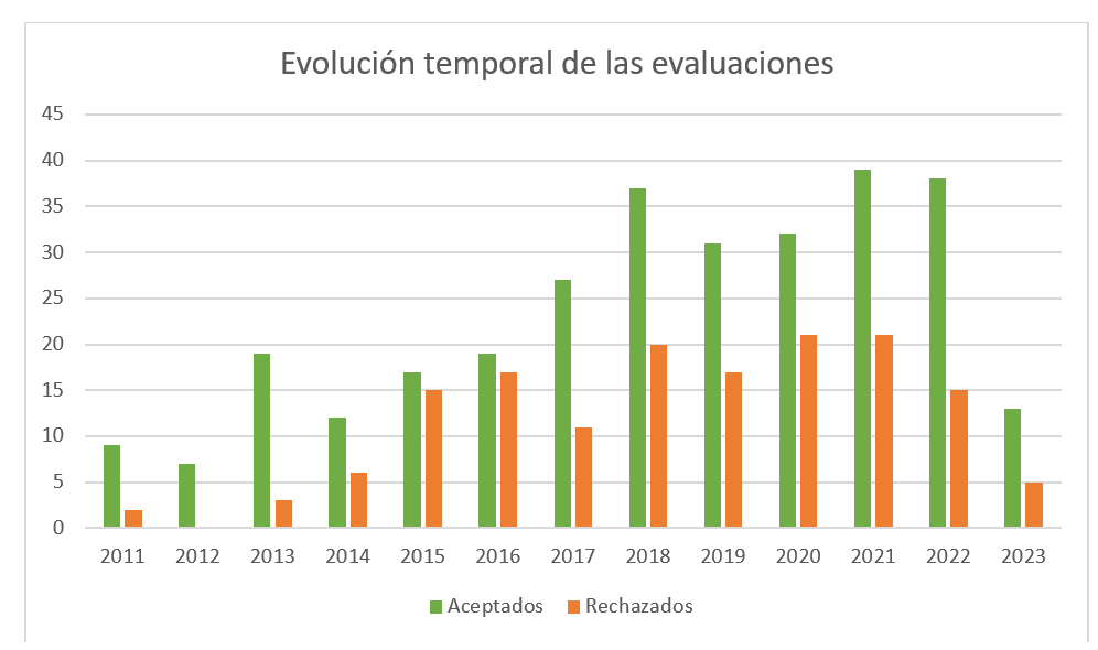 Desde 2011 hasta junio de 2023, se han evaluado un total de 453 artículos, siendo 300 aprobados y 153 rechazados. La evolución temporal se muestra en el gráfico 2.